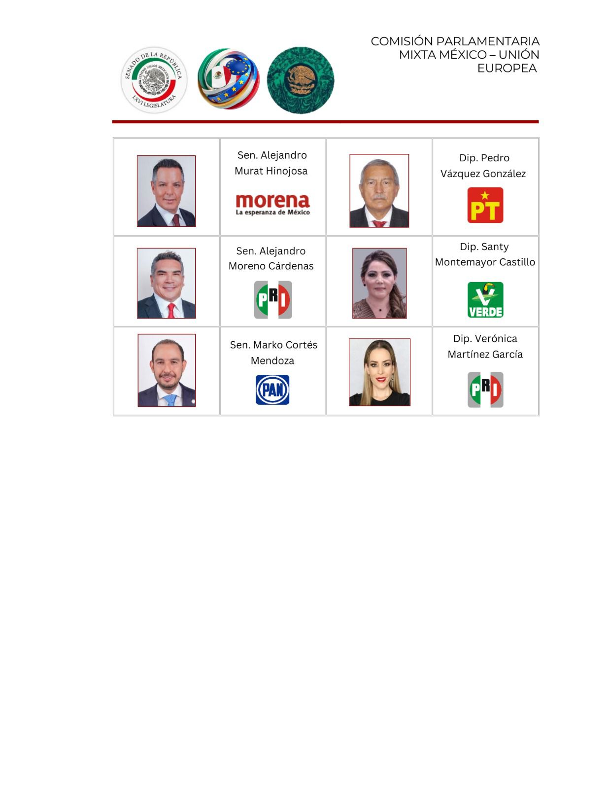 La delegación mexicana está integrada por 14 legisladores: siete senadores y siete diputados de distintos grupos parlamentarios. Entre sus integrantes se encuentran figuras como Alejandro Murat Hinojosa (Morena), Marko Cortés Mendoza (PAN), Alejandro Moreno Cárdenas (PRI), y Claudia Ruiz Massieu Salinas (MC). La vicepresidencia de la Comisión estará a cargo del diputado Pedro Haces Barba.