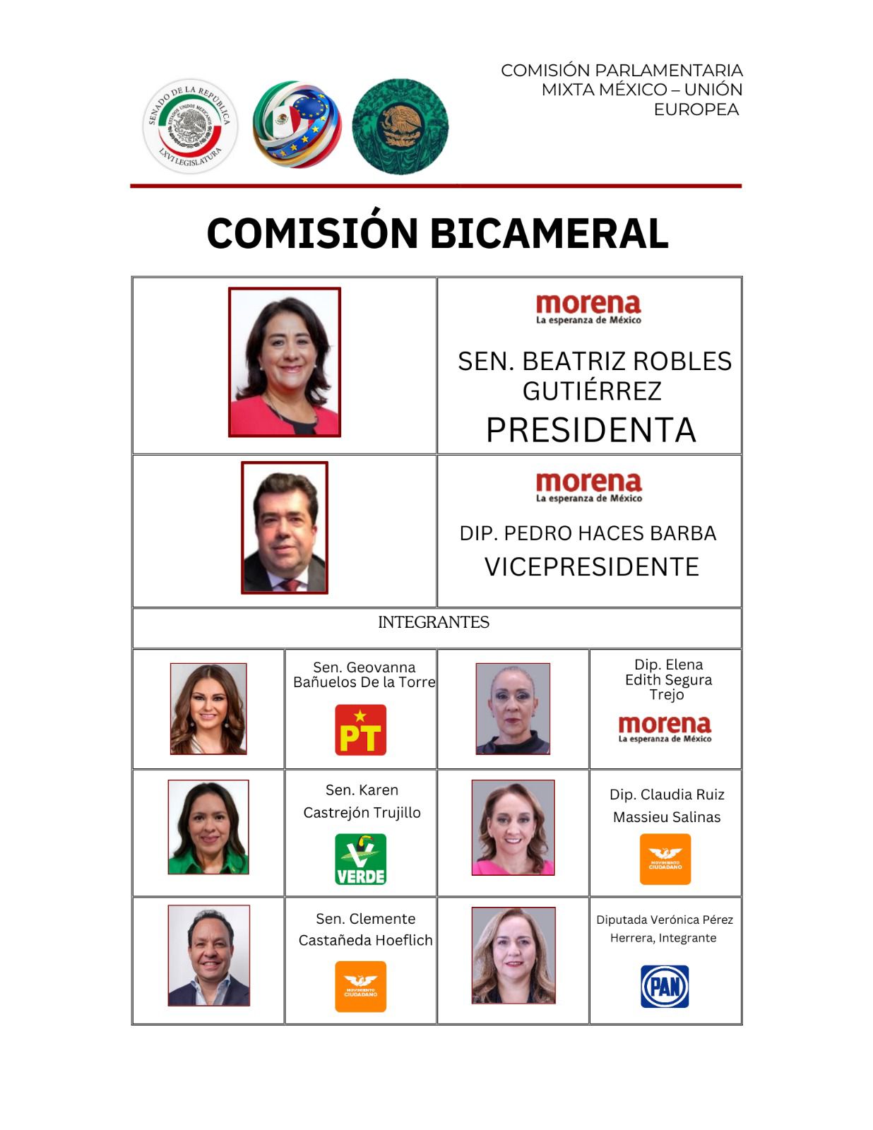 La delegación mexicana está integrada por 14 legisladores: siete senadores y siete diputados de distintos grupos parlamentarios. Entre sus integrantes se encuentran figuras como Alejandro Murat Hinojosa (Morena), Marko Cortés Mendoza (PAN), Alejandro Moreno Cárdenas (PRI), y Claudia Ruiz Massieu Salinas (MC). La vicepresidencia de la Comisión estará a cargo del diputado Pedro Haces Barba.